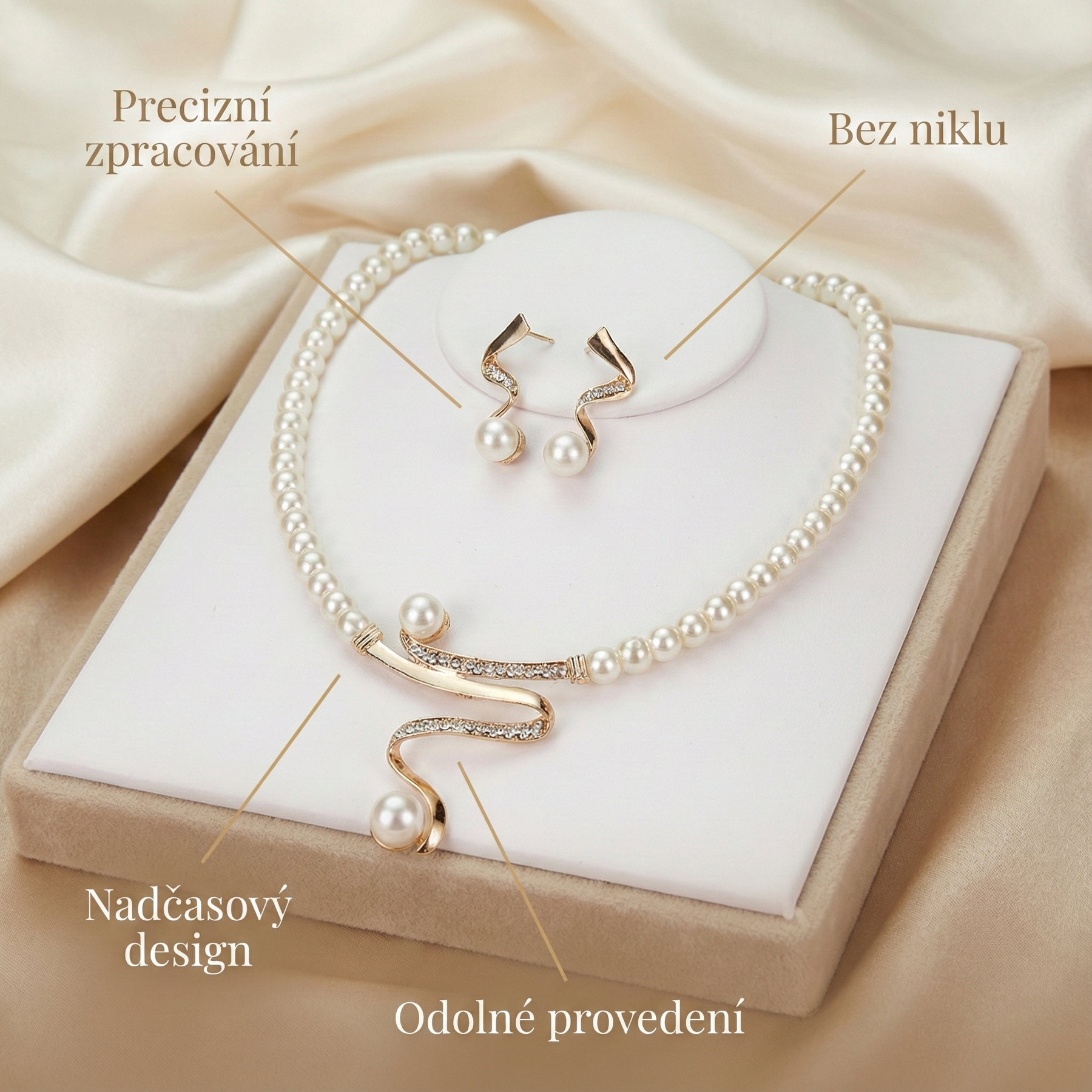 Design: colier elegant din perle cu detaliu auriu curbat + cercei asortați
